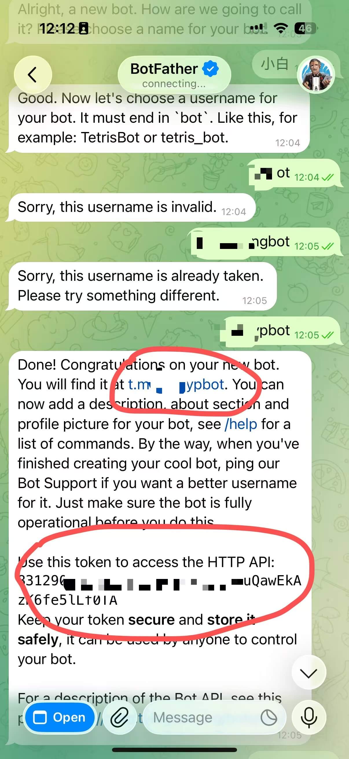 现在打开Telegram。搜索“@botfather”。发送 /newbot。给你的机器人命名。再复制bot token到终端输入。